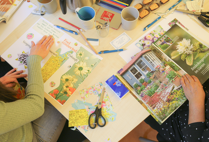 Mit der Frage ‚Was hat das Frauenhaus für mich bedeutet?‘ gestalten die Frauen eine Collage für das StoP-Fundbuch. Die intuitive kreative Arbeit unterstützt ihre Selbstdarstellung und lässt die persönlichen Geschichten sichtbar werden, die im Bild verankert sind. Es entstehen Erzählungen jenseits zugeschriebener Opferrollen, die durch den Raum des Zuhörens ihren Kampf und ihre Entwicklung würdigen.